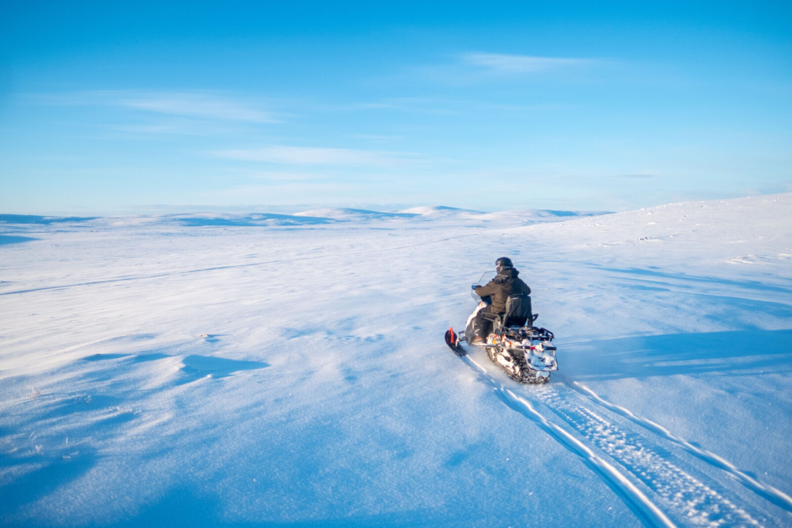 After breakfast, the snowmobile safari starts at the 70North location near Tunturikelo. We drive along the snowmobile route deeper into the Kaldoaivi wilderness and finally through the wilderness to the Riekkojärvi wilderness cottage. On the way, we will stop for lunch at a cottage Skiehtsaras located in the middle of the wilderness. Riekkojärvi offers a sauna, and dinner is prepared in the evening.