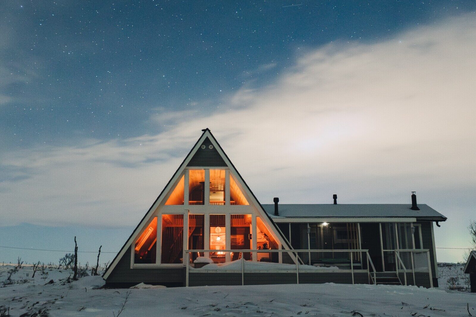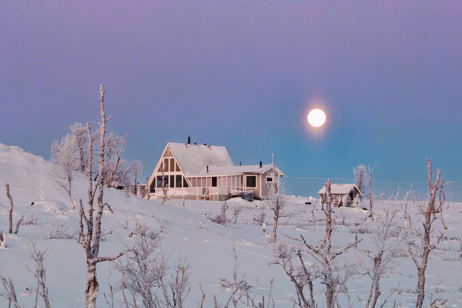 The shared living room and kitchen open up to beautiful views of the wilderness all year round. During the dark season, you can see the sun hiding behind the horizon, turning the river reddish, in the summer, reindeer moving around nearby may wander into the yard, and grouse are not a rare sight in the yards of our cottages.