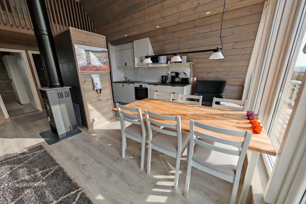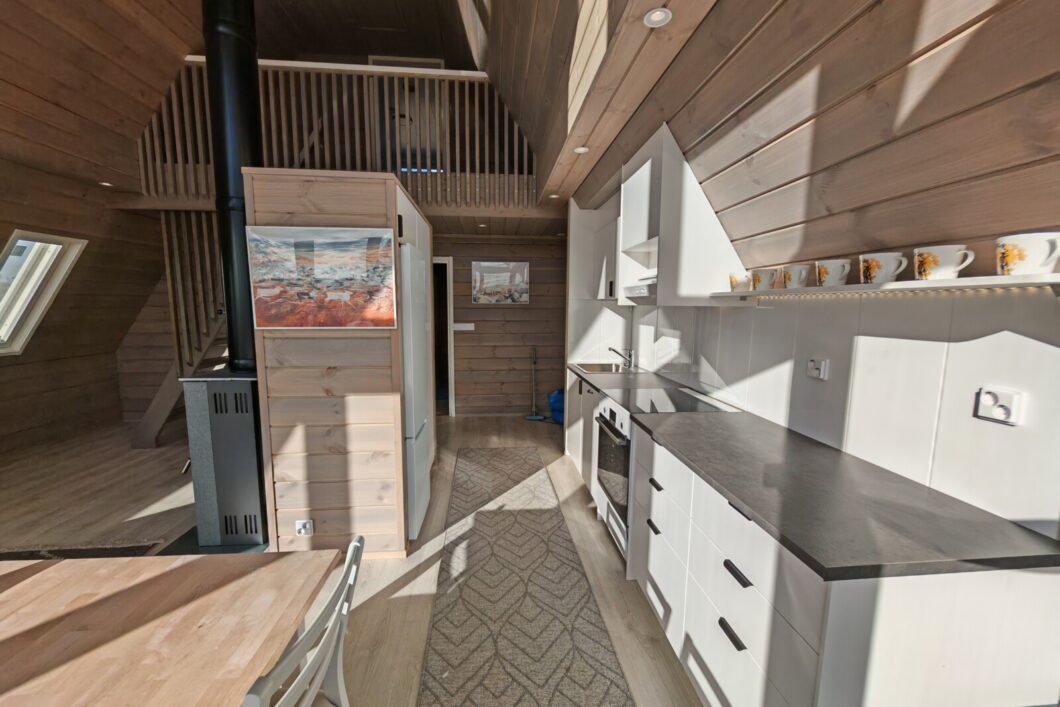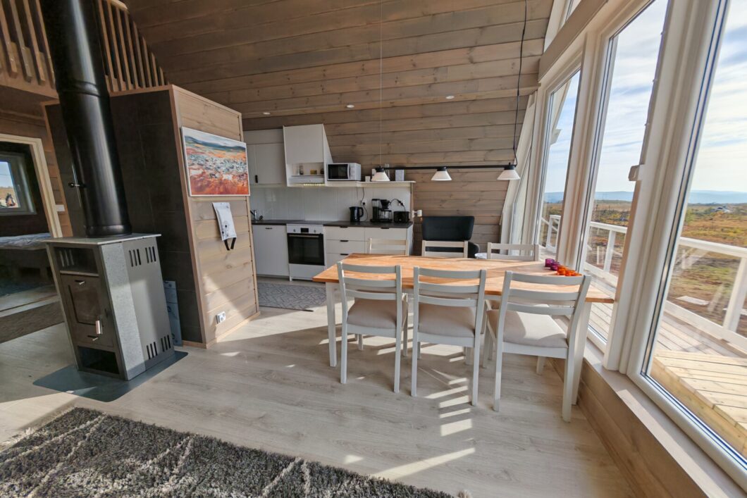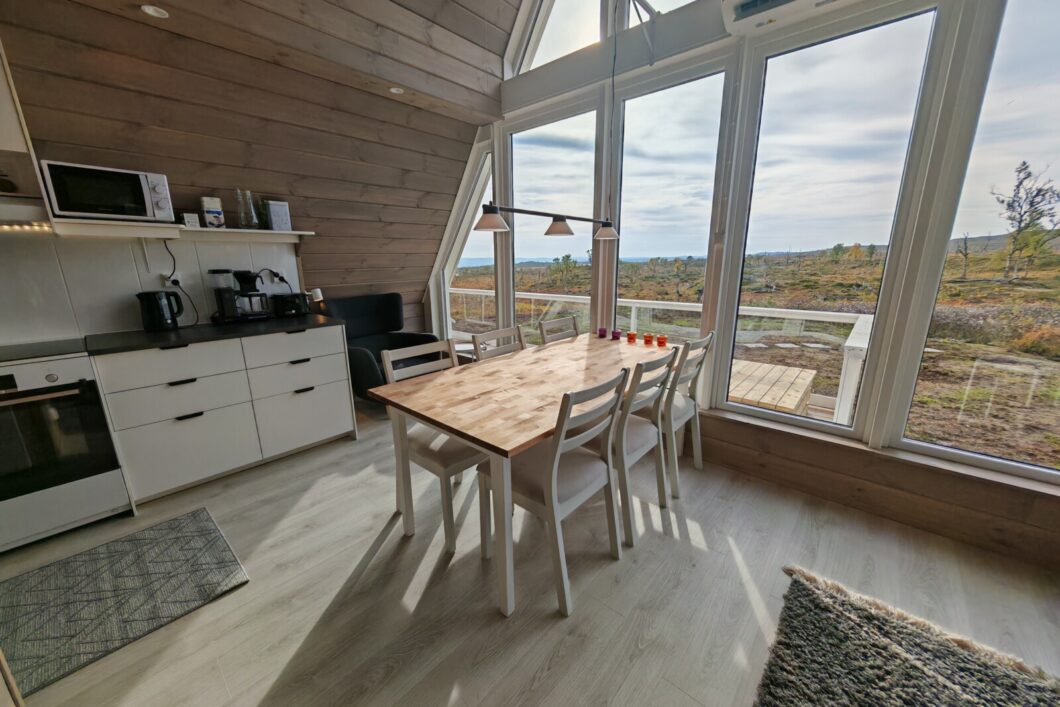 Jaetusta olohuone-keittiöstä avautuu kauniit maisemat erämaaluontoon ympärivuotisesti. Kaamoksen aikaan näet horisontin takana piilottelevan auringon punertavan kajon, kesäaikaan lähimailla liikuskelevat porot saattavat poiketa pihaan saakka eivätkä riekotkaan ole harvinainen näky mökkiemme pihapiireissä.