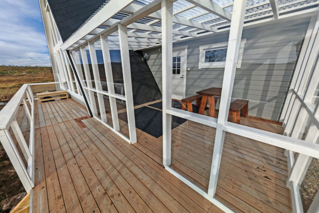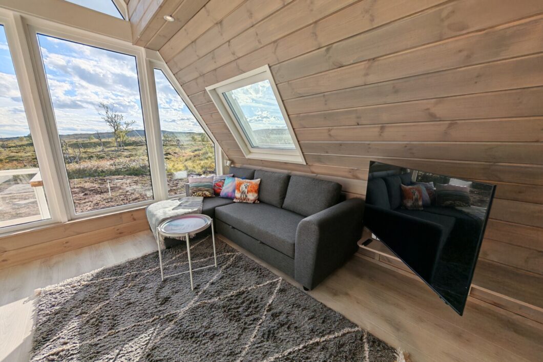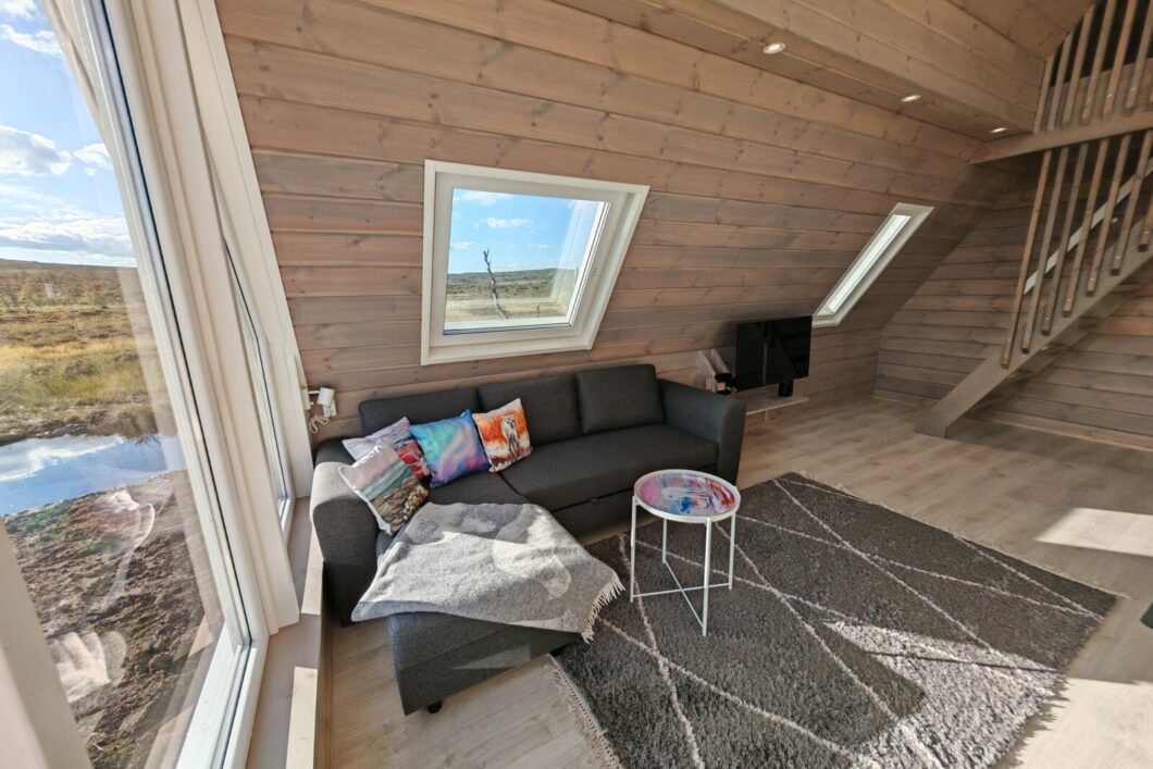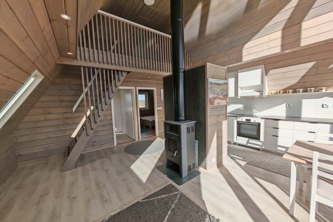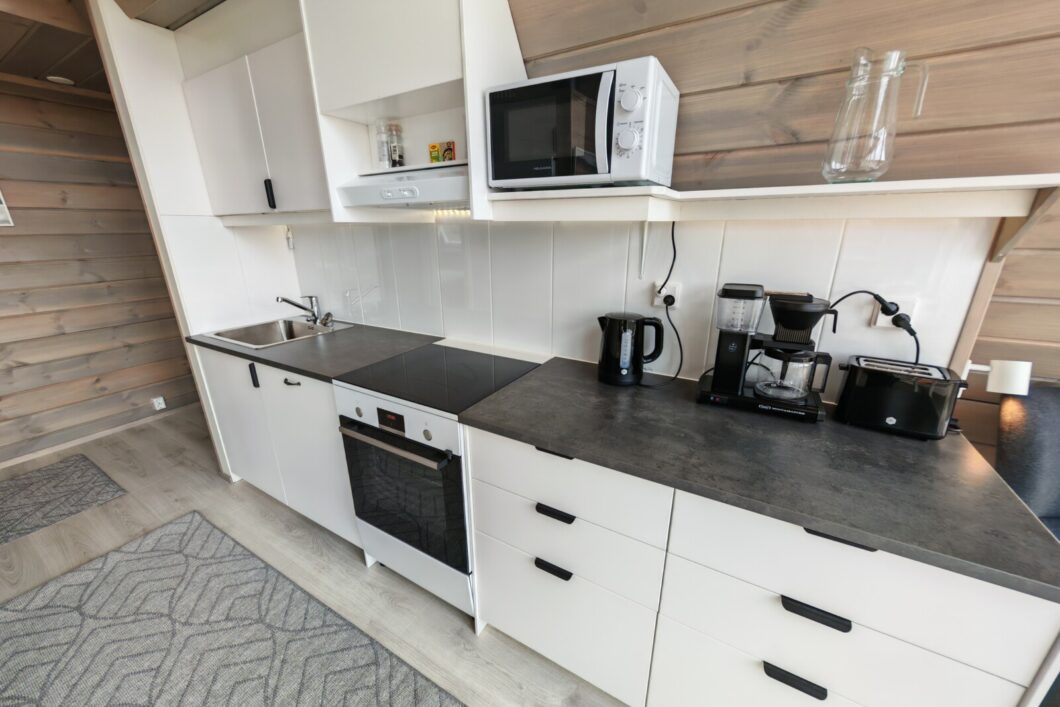 Jaetusta olohuone-keittiöstä avautuu kauniit maisemat erämaaluontoon ympärivuotisesti. Kaamoksen aikaan näet horisontin takana piilottelevan auringon punertavan kajon, kesäaikaan lähimailla liikuskelevat porot saattavat poiketa pihaan saakka eivätkä riekotkaan ole harvinainen näky mökkiemme pihapiireissä.