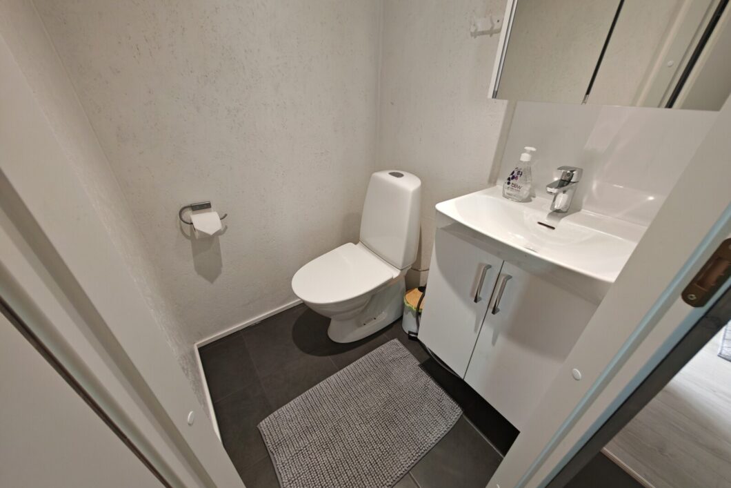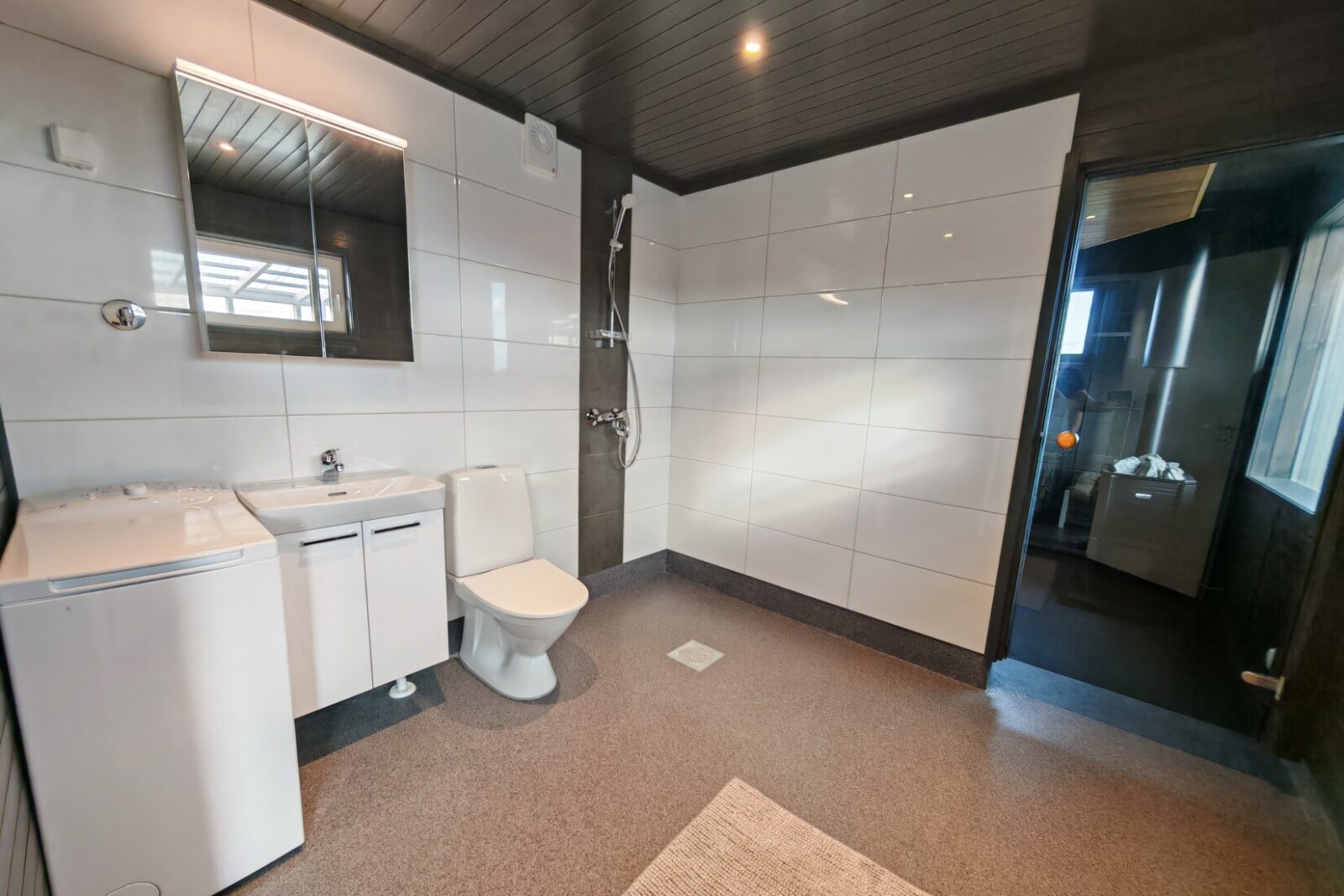 Mökissä on erillinen wc- ja kylpyhuone. Kylpyhuoneessa on wc-pönttö, suihku, käsienpesuallas peilikaapilla sekä pesukone.