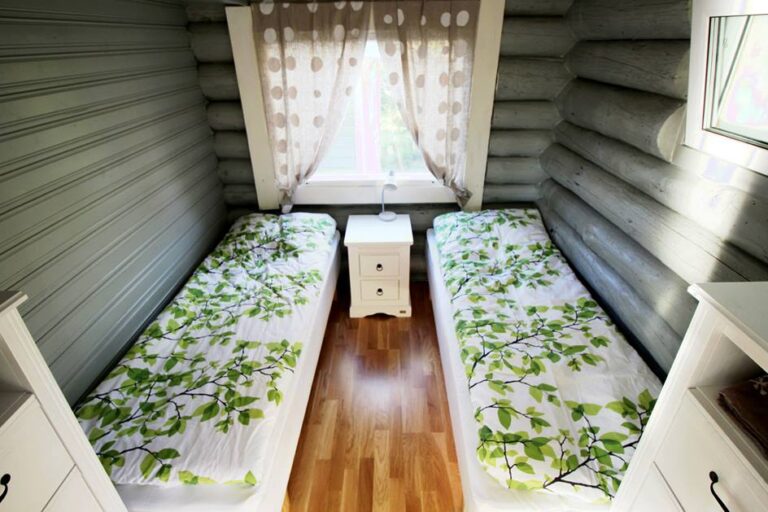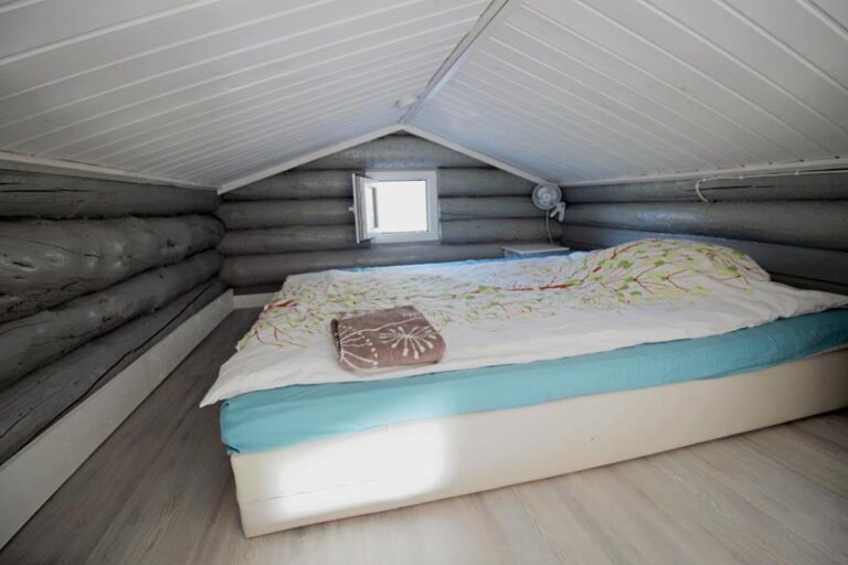 Mökissä yöpyy mukavasti kuusi henkeä kahdessa kahden hengen makuuhuoneissa ja yläkerran alkovissa.
