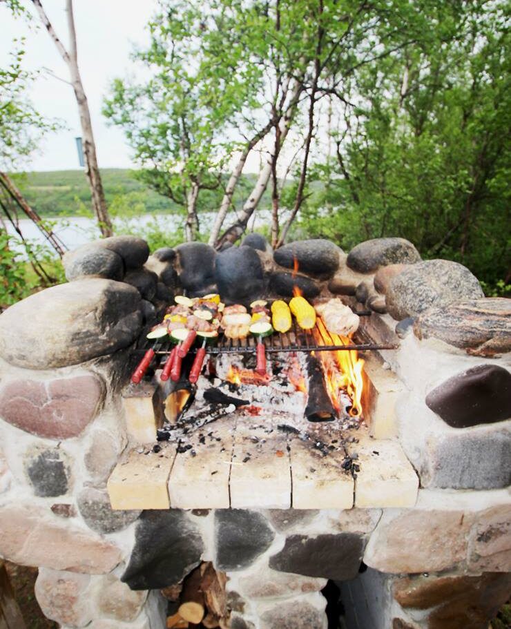 Mökin pihalta löytyy nuotiopaikka, jossa voit tehdä ruoat nauttien jokimaisemasta.