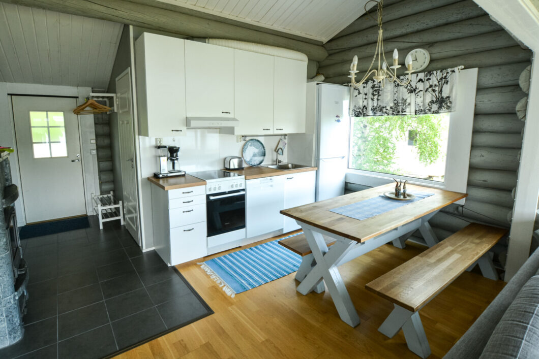 Mökistä löydät täysin varustellun keittiön mikrolla ja veden- sekä kahvinkeittimineen. Jääkaapin yhteydessä on myös pakastin ja tiskit peseytyvät tiskikoneella. Tiski- ja pesuaineet ovat talon puolesta.