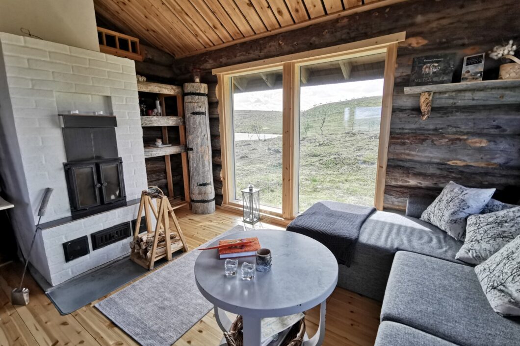 Mökissä on mukava olohuone sohvasängyllä sekä parisänky parvella. Mökin suurista ikkunoista avautuu upea maisema erämaahan.
