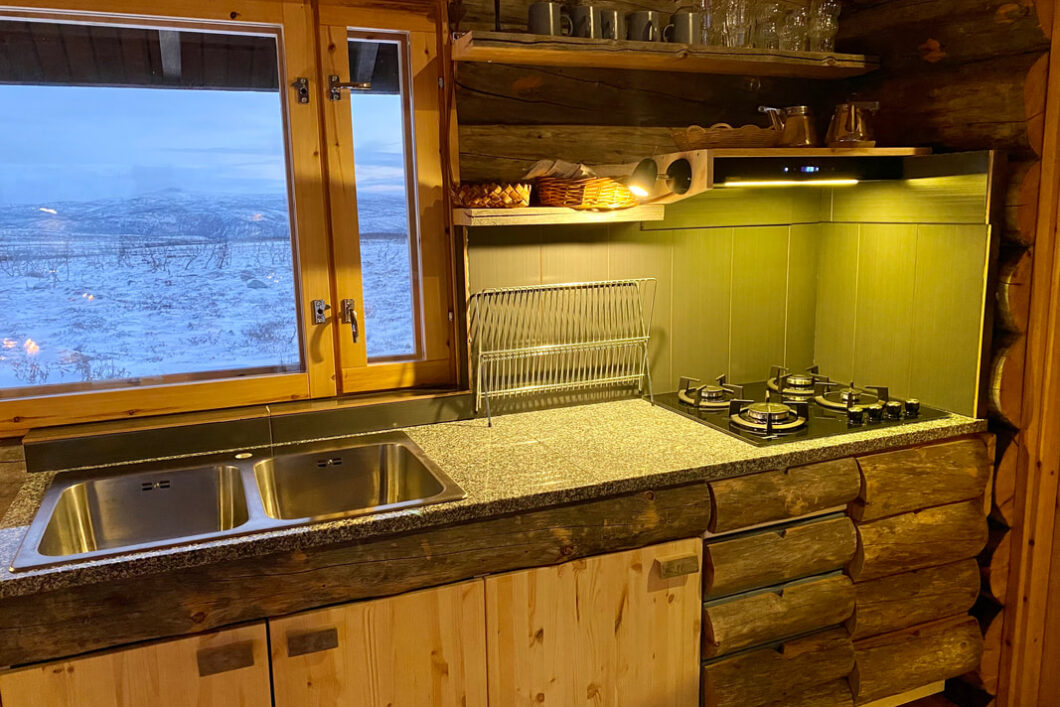 Mökissä on 12V aurinkopaneeli, LED- valot sekä USB- pistoke puhelimen latausta varten. Keittiössä on kaasuhella sekä taso kokkailua varten. Talousvedet pystyt ottamaan läheisestä tunturilammesta, mökillä ei erikseen ole juomavettä.